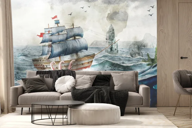 fale, rafa koralowa, pokój dziecięcy, statki, akwarela, morze, ocean, świat, ryby