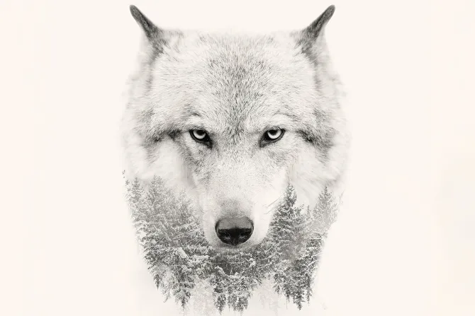 Portret wilka z imitacją lasu iglastego.