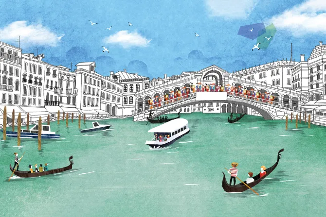 Ręcznie rysowany most Rialto z gondolami.