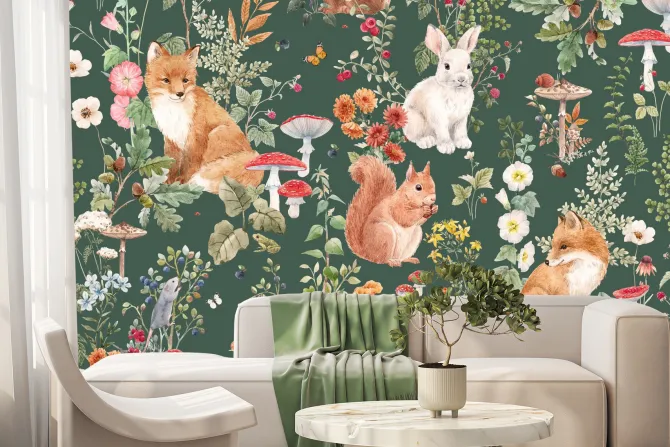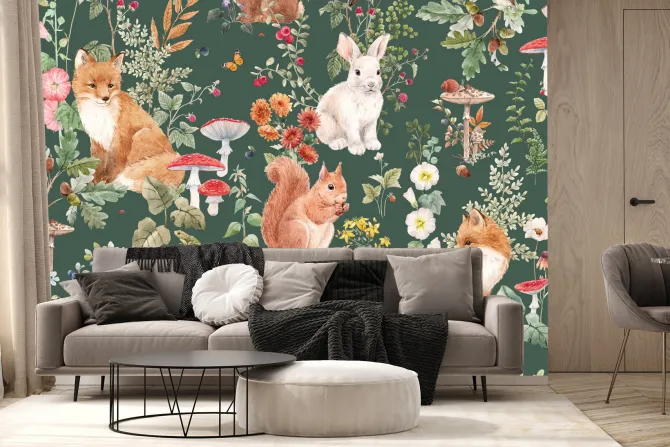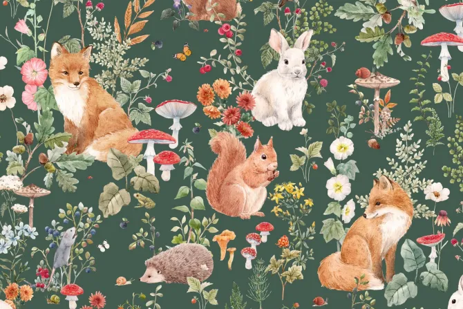Roślinny wzór z grzybami i lisami.