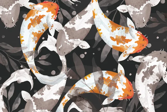 Ryby koi i liście na ciemnym tle akwarelowy wzór.
