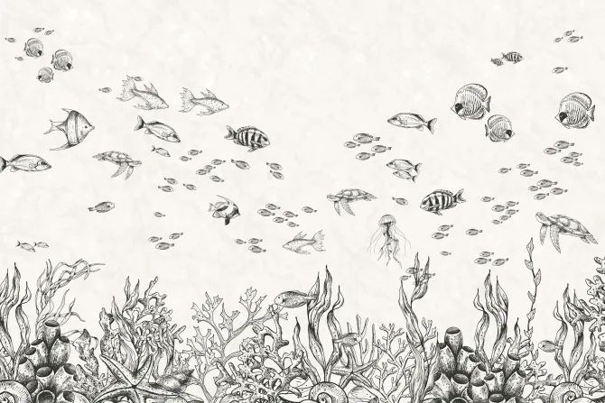 czarno-Białe, rysunek, minimalistyczne, rafa koralowa, muszle, rośliny, ryby