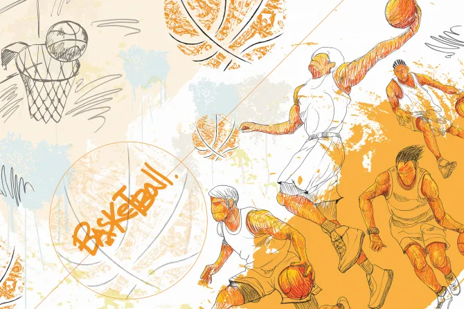Rysunek z koszykarzami i piłkami.