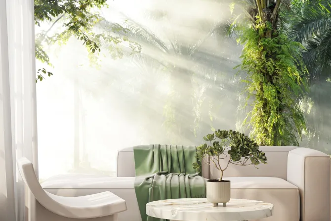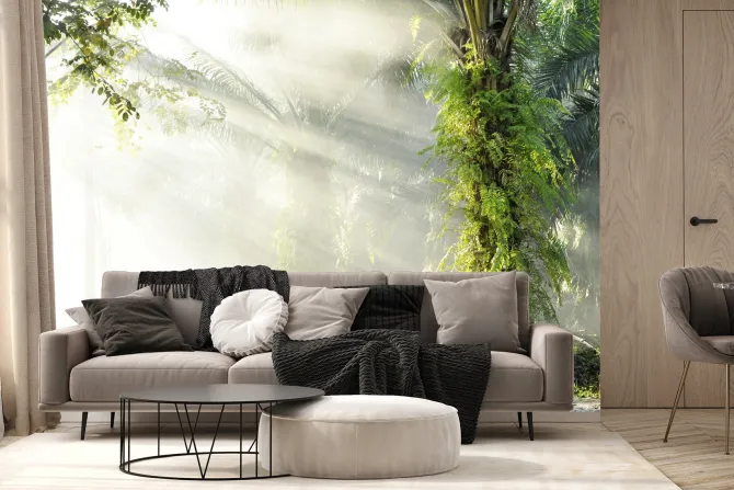 Fototapeta: Słoneczny poranek w tropikalnym lesie z palmami
