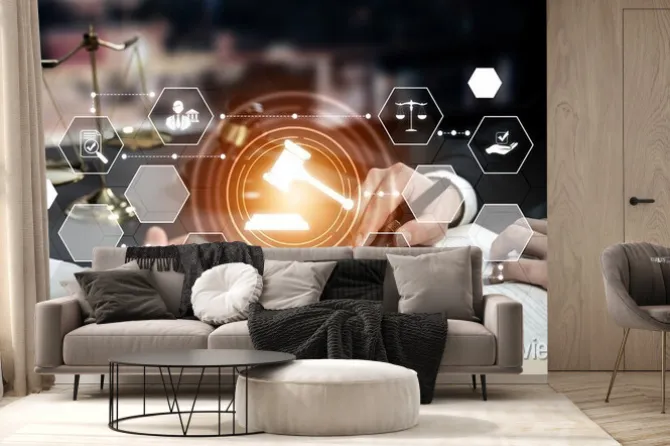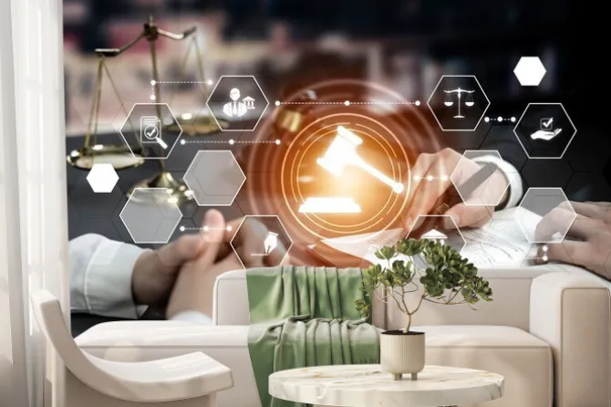 Smart law, legal advice icons and lawyer working tools in the lawyers office showing concept of digital law and online technology of astute law and regulations ..