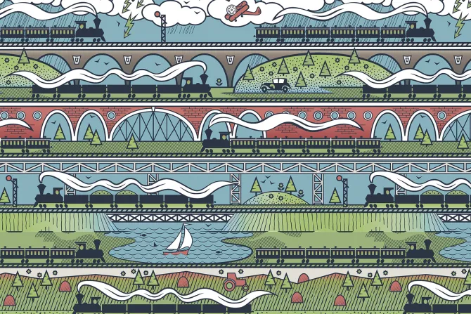 rośliny, roślinność, zieleń, transport rzeczny, środki transportu, krowy, mosty, drzewo, pociągi