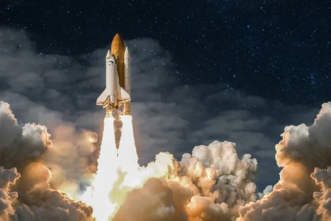 Fototapeta: Start statku kosmicznego nocą wśród chmur