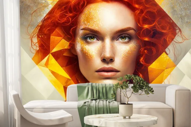 Striking portrait of a beautiful woman with curly red hair and a shimmering golden outfit, set against a background of abstract geometric shapes, generative ai.