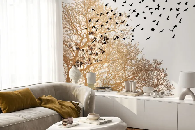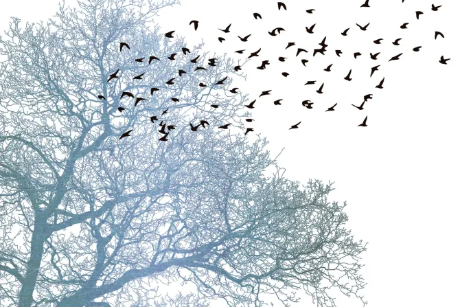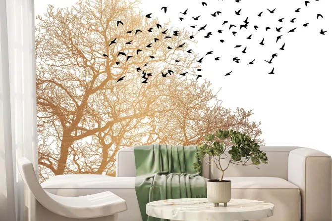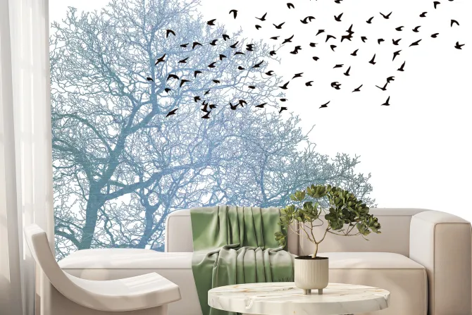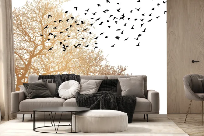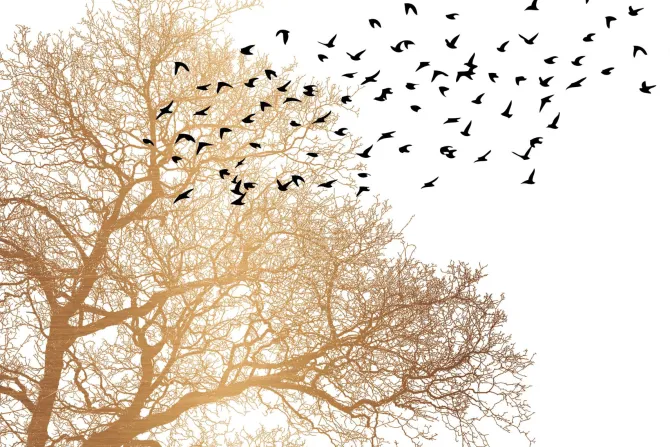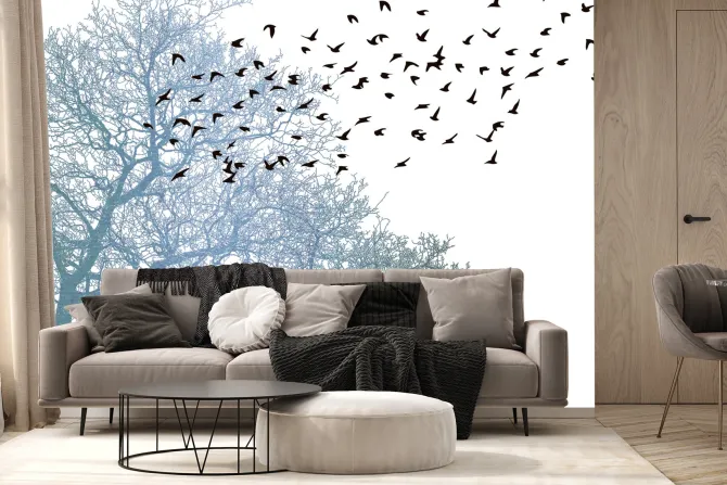 Sylwetki ptaków i drzewa w minimalistycznym stylu.