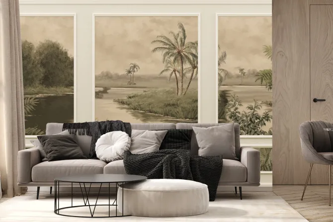 Tropikalna rzeka z palmami w sztukaterii.