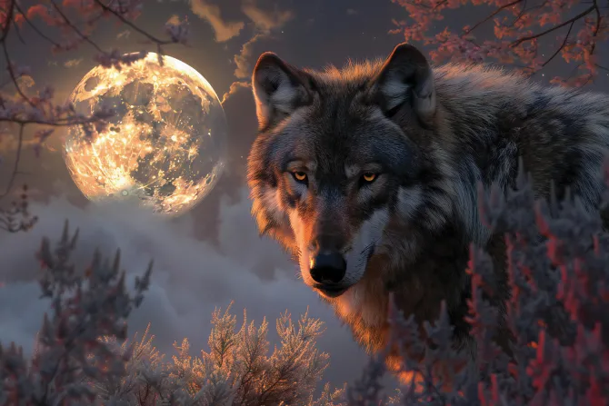 Fototapeta: Wilk wśród roślinności na tle pełni księżyca