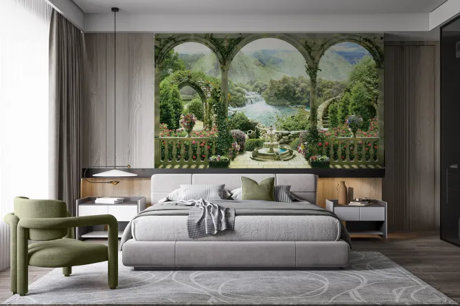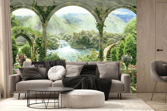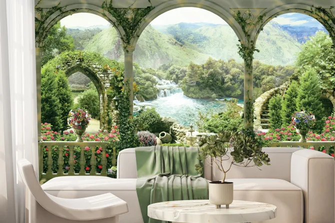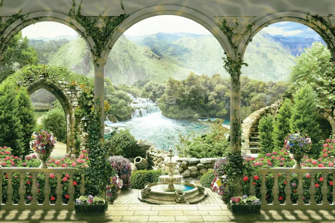 Fototapeta: Zabytkowe łuki z widokiem na rajski ogród