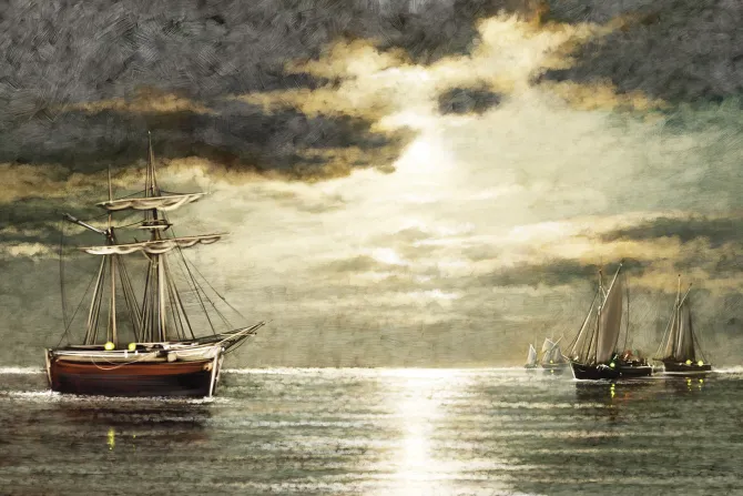 Żaglowce na morzu z promieniami światła.