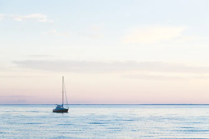 Żaglówka pływająca na morzu przy zachodzie słońca.
