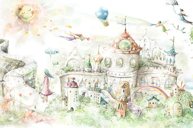 słońce, rysunek, wróżka, akwarela, kwiaty, zamek, bajki, malarstwo