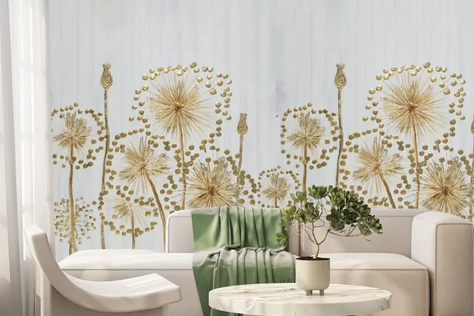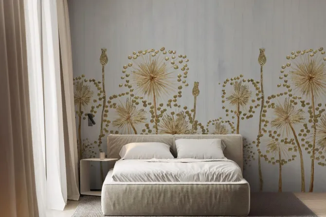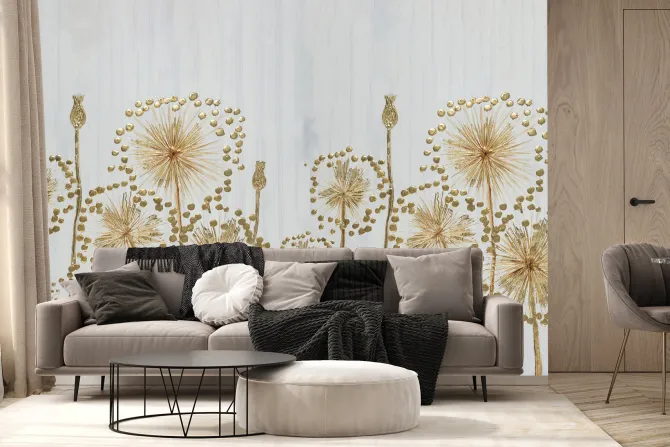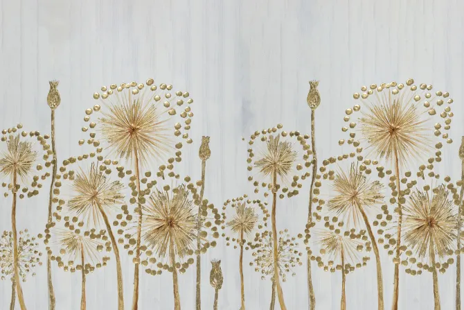 Złote malowane kwiaty na szarym tle.