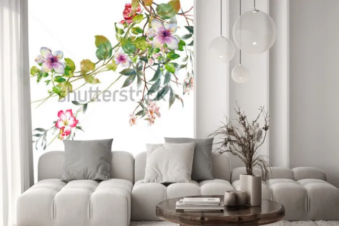 Naklejka: Akwarela malarstwo liści i kwiatów, na białym tle