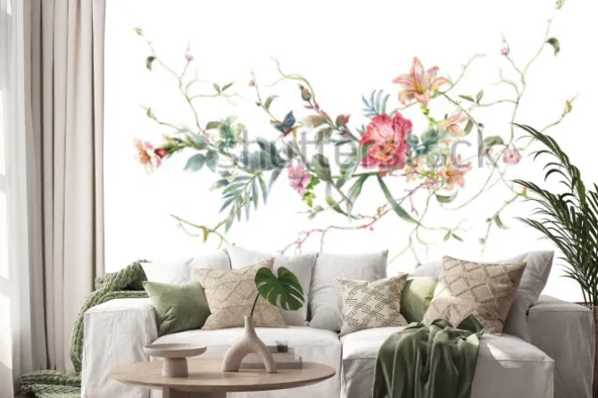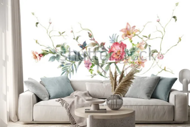 Naklejka: Akwarela malarstwo liści i kwiatów, na białym tle