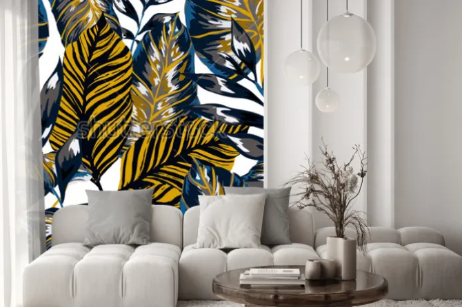 Naklejka: Akwarelowy wzór z tropikalnych liści: palmy, monstera, marakuja.
