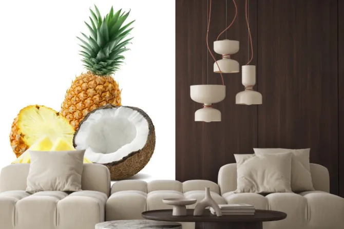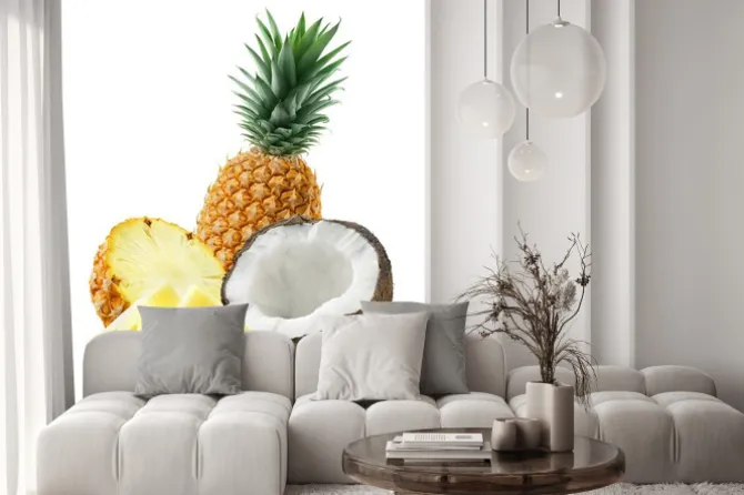 Naklejka: Ananas kawałki kokosa kompozycja 4 wyizolowanych na białym backgro
