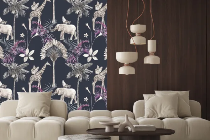 Beautiful vector african safari animal tropical seamless pattern. Trendy style. Print with elephants and giraffe. Dark background,.