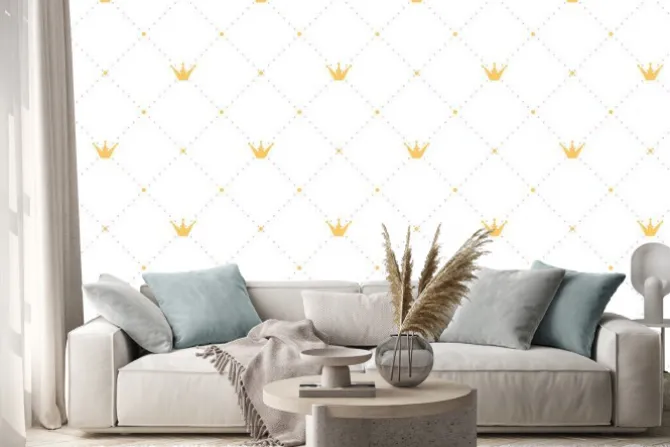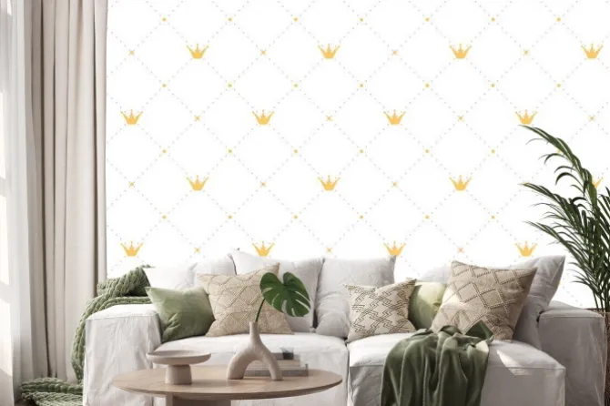Naklejka: Bez szwu deseń w stylu retro ze złotą koroną i różowy kropki
