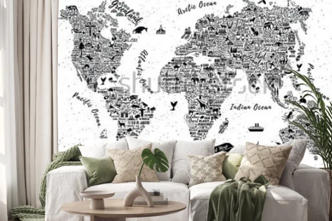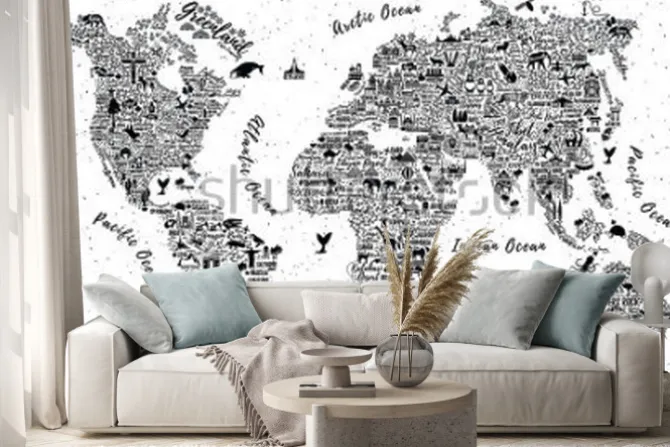 Naklejka: Czarno-biała mapa świata z ikonami zabytków i zwierząt