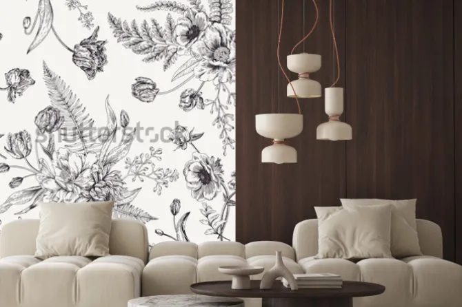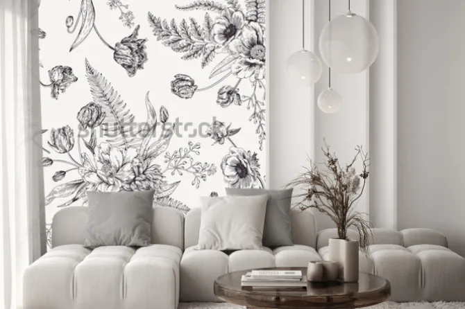 Czarno-biały wzór z piwoniami i tulipanami.