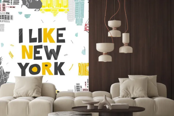 Decorative banner with symbols and attractions and the words I love New York. Postcard for tourists, travel guides, invitations. Poster for wall decoration in the room, classroom. Vector illustration..