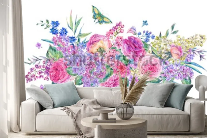Dekoracyjny rocznika akwareli kartka z pozdrowieniami z różowymi różami, bzami, kwiatami, liściem i pączkami, botaniczna kwiecista ilustracja odizolowywająca na białym tle.