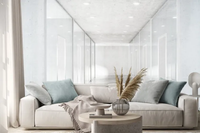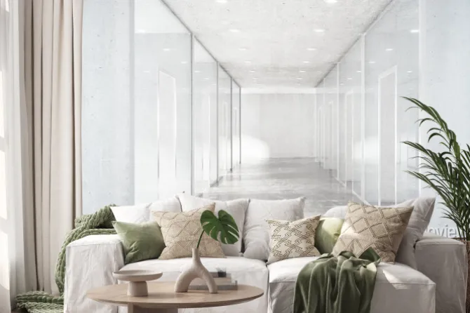 Długi korytarz z betonową podłogą i przezroczystych ścian w Moder.