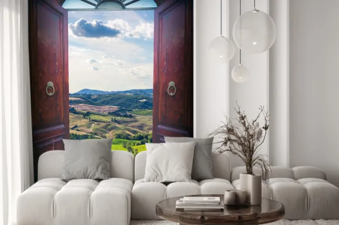 Drzwi otwarte na zielone pagórki.