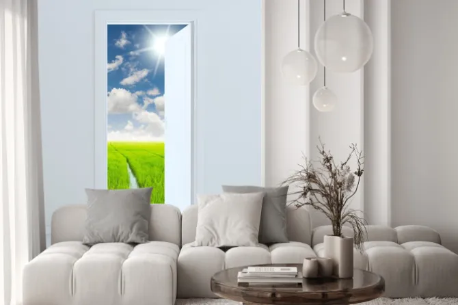 Drzwi otwarte na zielonym polu kosmetycznym.
