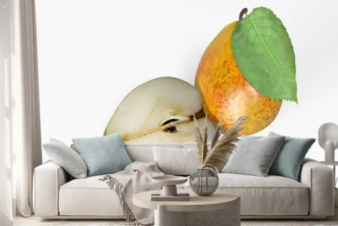 Naklejka: Dwie gruszki, jeden krojone na pół, pojedyncze owoce na białym