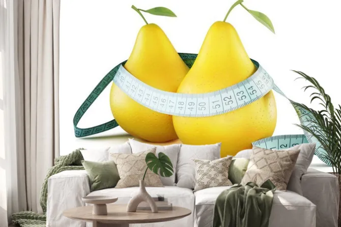 Naklejka: Dwie gruszki owinięte w metrach. konceptualnych. 3d ilustracji.