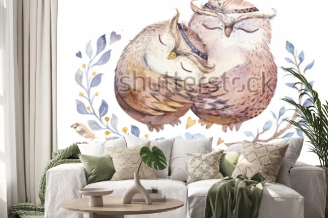 Naklejka: Dwie przytulone do siebie sówki w stylu akwareli