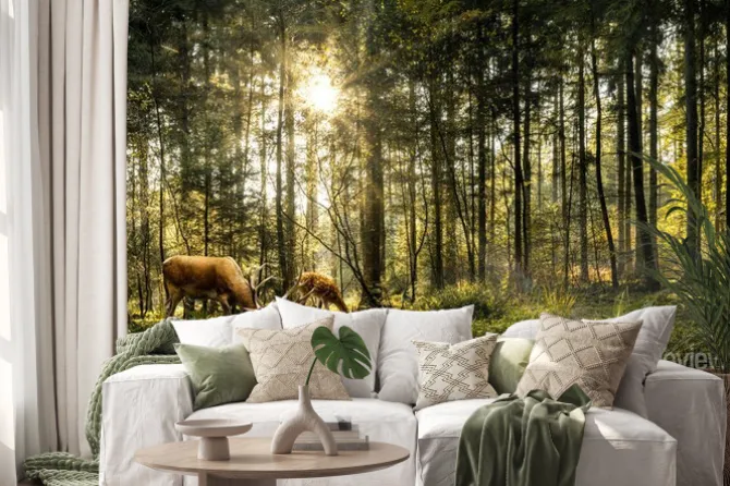 Naklejka: Dziki jeleń i sarna w zielonym lesie