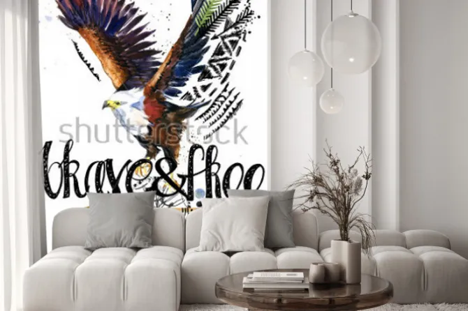 Eagle. American Indian Chief Headdress. war bonnet. dream catcher background. native american poster. animal illustration. brave and free hand written text. .