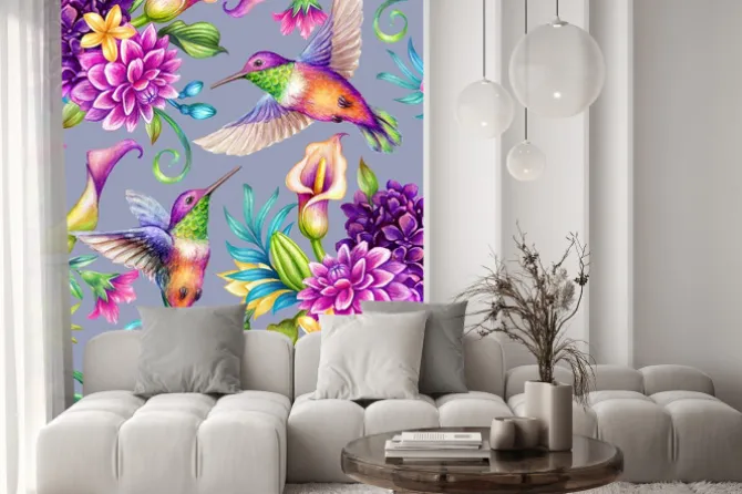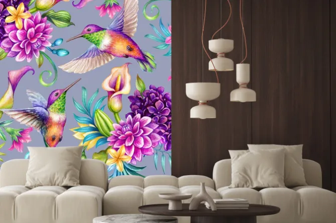 Naklejka: Egzotyczne kwiaty i kolibry w akwarelowej kompozycji