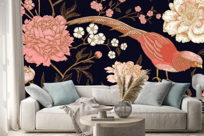 Egzotyczny wzór z bażantem w kwiatach.