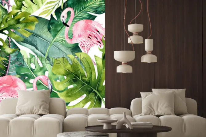 Naklejka: Flamingi w dużych tropikalnych liściach