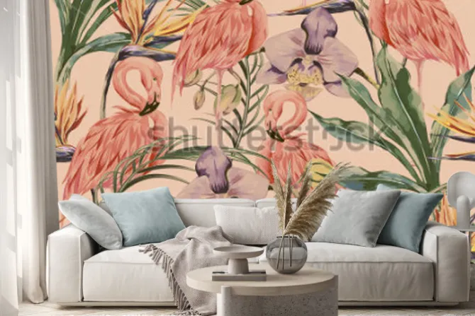 Naklejka: Flamingi wśród storczyków i liści w stylu akwarelowym
