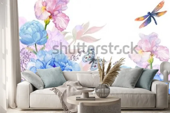 Floral background .illustration of watercolor. flowers peonies, irises, hydrangeas,butterflies and dragonflies . postcard floral pattern.