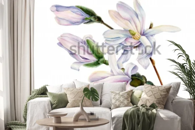 Naklejka: Gałąź wiosennych kwiatów magnolii na na białym tle, akwarela,