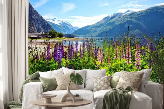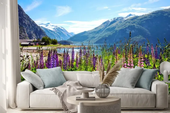 styl skandynawski, krajobrazy, drzewa, niebo, kwiaty, góry, las, zieleń, różowy