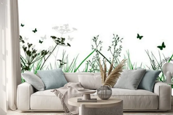 Green grass. The horizontal line of the grass. Summer meadow with flowers and butterflies. Vector illustration.