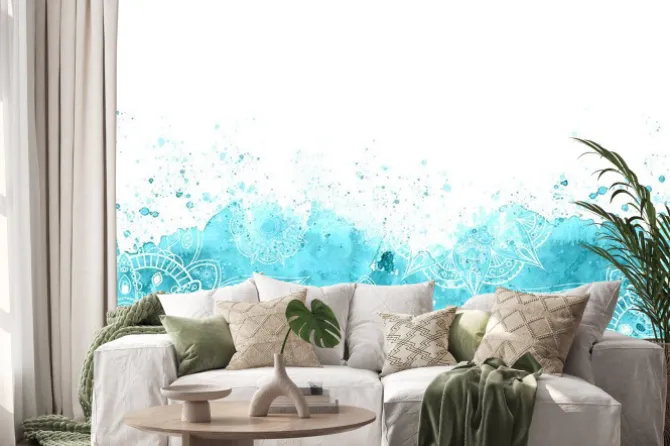 Naklejka: Hand-drawn watercolor border with blue background and mandala