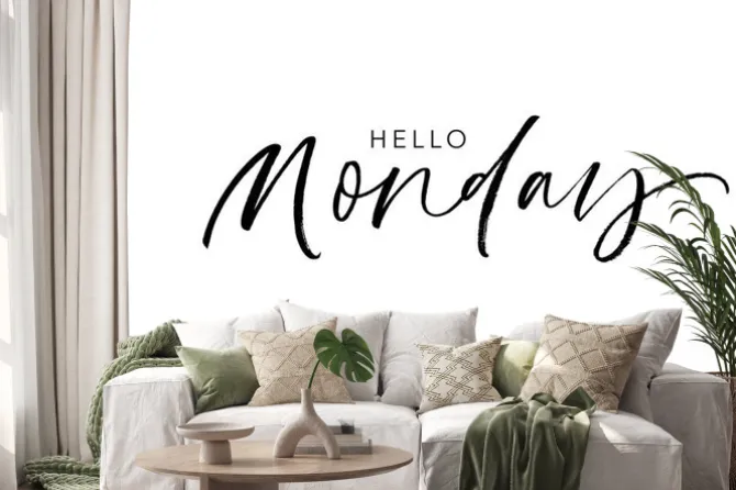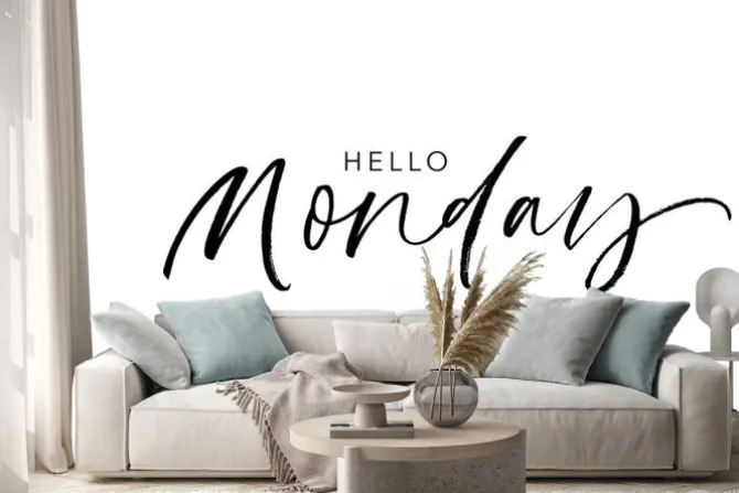 Naklejka: Hello monday phrase. vector hand drawn brush style modern calligraphy.