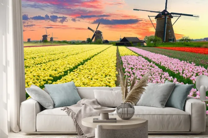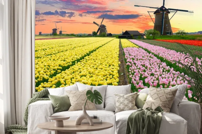 Naklejka: Holenderski wiatrak na polu tulipanów