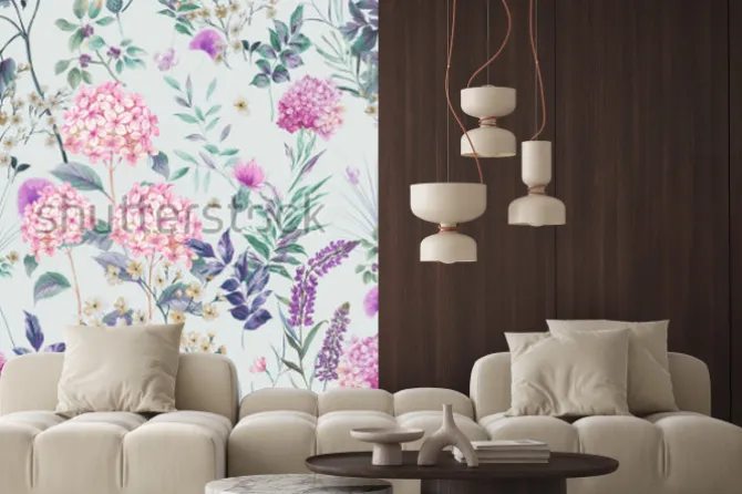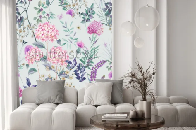 Naklejka: Hortensje i polne kwiaty na błękitnym tle